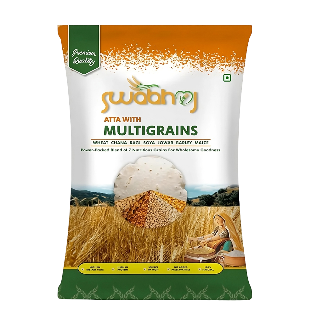 Swabhoj atta with multigrain is a premium flour blend that combines the goodness of wheat with a variety of wholesome grains, including barley, oats, millet, and corn. Carefully crafted to preserve the natural nutrients, this atta offers a perfect balance of taste and health. Packed with fiber, proteins, and essential vitamins, it is the ideal choice for health-conscious individuals.